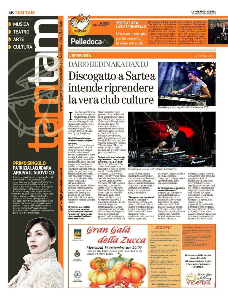 Discogatto a Sartea intende riprendere la vera club culture TAM TAM il Giornale di Vicenza 18.09.2018 Intervista di Stefano Rossi DOWNLOAD/SCARICA il file .pdf dell’intervista. Buona lettura!