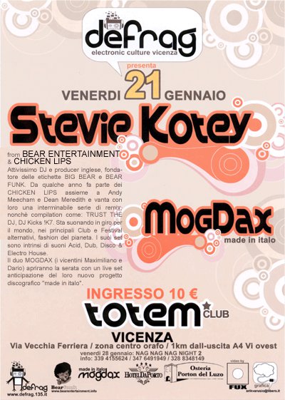 MOGDAX: Live set MADE IN ITALO project @Totem Club Vicenza MOGDAX composed by two old friends Mog and Dax, both raised in the electronic music. The two of them, from the early nineties, have always encircling the electronic scene, Mog as a musician and Dax as a DJ.