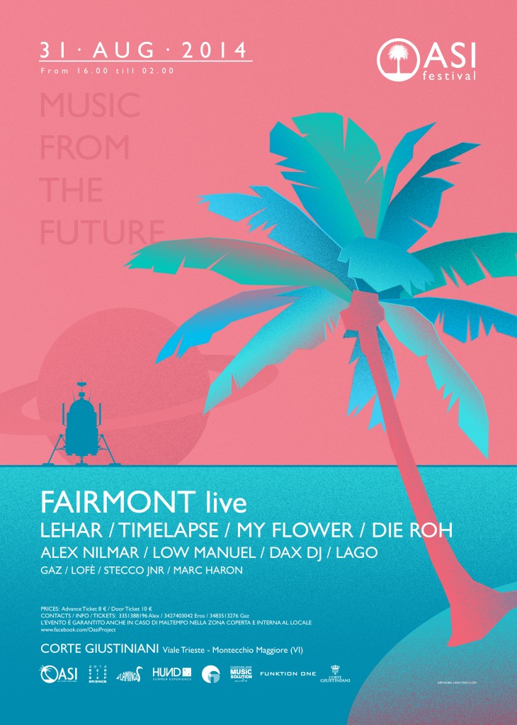 Headliner della serata è il canadese Fairmont, un artista che raramente si ha la possibiltà di ascoltare in Italia; con oltre 11 anni di carriera, più di 20.000 copie vendute con la hit Gazebo, si può ormai definire una leggenda, una figura chiave nel mondo della musica elettronica ! Oltre al suo live eseguito solo con macchine analogiche, ci saranno Lehar, Timelapse, My Flower, Die Roh, Alex Nilmar, Dax dj, Lago, Low Manuel oltre ai dj resident del progetto Oasi per un totale di 13 artisti divisi in 2 stage attivi dalle 16.00 alle 2.00.