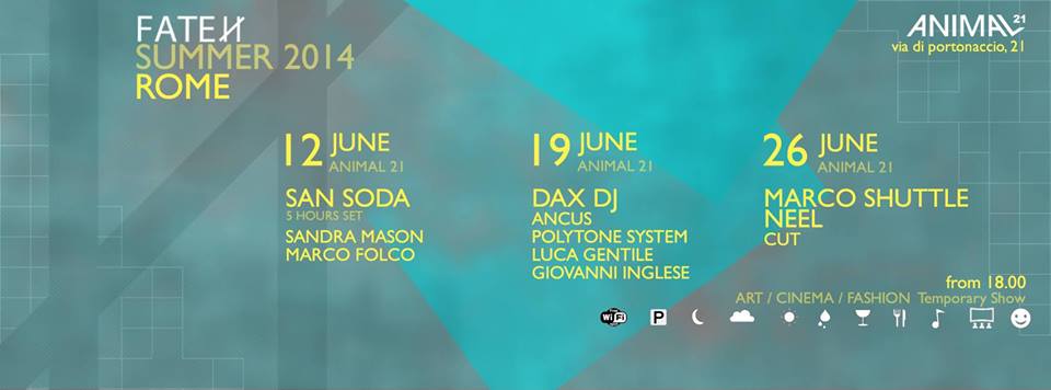 Dax DJ Ancus Polytone System Luca Gentile Giovanni Inglese RA event ANIMAL 21 Via di Portonaccio, 21 ROMA Struttura: salette chiuse/aperte ed ampio giardino allestito; possibilità di prenotare i tavoli per cena o dopo cena; parcheggio interno, soprattutto motorini e biciclette. Bar: cocktail in vetro, servizio al tavolo, frutta fresca, frullati, centrifughe, macedonie. Cucina: servizio […]