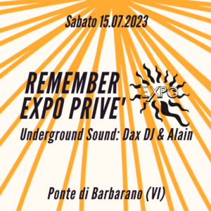 Remember Expo Privé Sabato 15.07.2023 dalle 21:30 Underground Sound: Dax DJ & Alain Thanks Pro Loco Ponte c/o La sagra del Redentore – Area Giovani “Shake” – Ponte di Barbarano