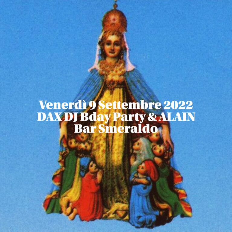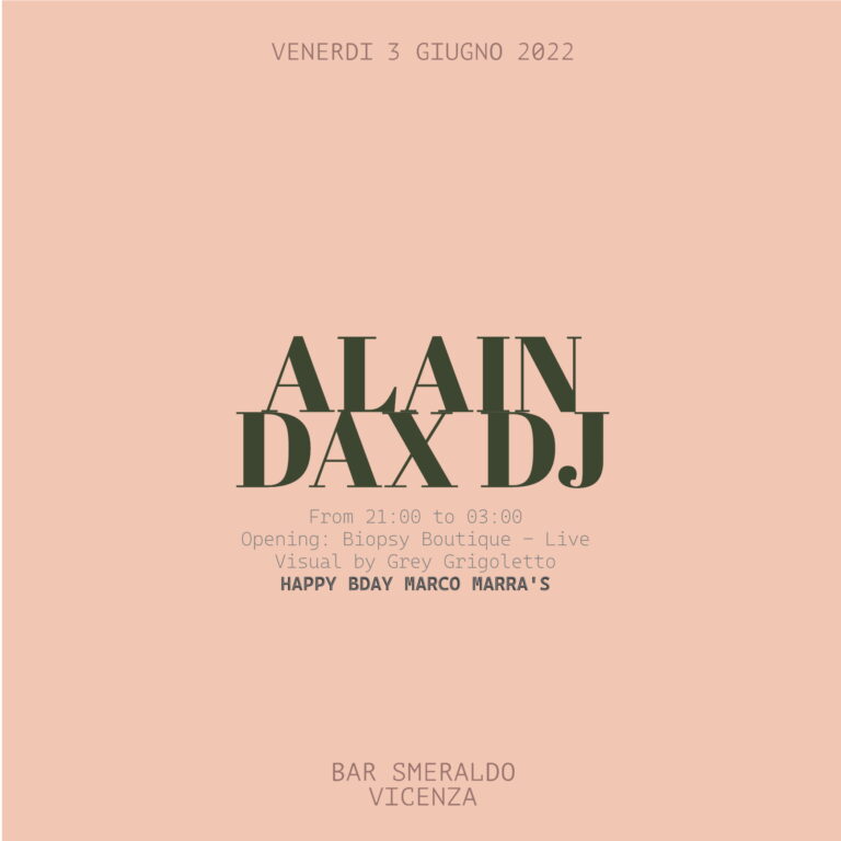 VENERDI 3 GIUGNO 2022 ALAIN DAX DJ From 21:00 to 03:00 Opening: Biopsy Boutique – Live Visual by Grey Grigoletto HAPPY BDAY MARCO MARRA’S Bar Smeraldo Vicenza