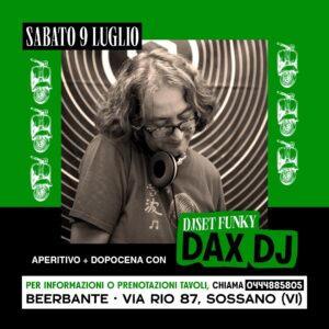Sabato 9 luglio 2022 Apertivo + Dopocena Dax DJ Beerbante – Via Rio, 87 – 36040 Sossano Prenota il tuo tavolo al 0444/885805