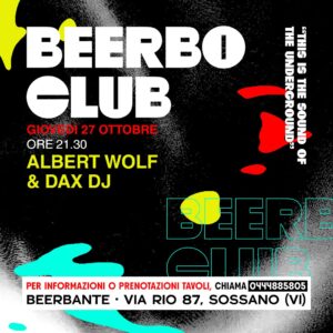 Giovedì 27 Ottobre 2022, ore 21:30 “This is the sound of the underground” Albert Wolf & Dax DJ Per informazioni o prenotazioni, chiama 0444 885805 Beerbante – Via Rio, 87