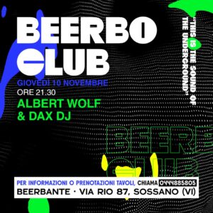 Giovedì 10 Novembre 2022, ore 21:30 “This is the sound of the underground” Albert Wolf & Dax DJ Per informazioni o prenotazioni, chiama 0444 885805 Beerbante – Via Rio, 87