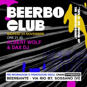 Giovedì 24 Novembre 2022, ore 21:30 “This is the sound of the underground” Albert Wolf & Dax DJ Per informazioni o prenotazioni, chiama 0444 885805 Beerbante – Via Rio, 87