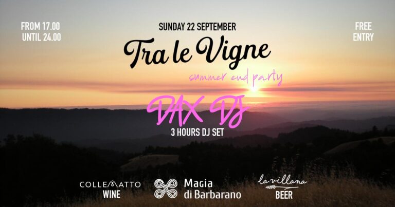 Domenica 22.09.2024 17:00 to 24:00 Tra Le Vigne Summer End Party Dax DJ 3 hours dj set FREE ENTRY Per info: 389 174 9789 c/o Magia di Barbarano – via