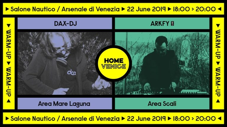 #HomeVenice Festival Warm-Up ∙ Salone Nautico Venezia? 22/06/2019⏰ 18:00 – 20:00? Arsenale di Venezia ? ? Programma: Area Mare Laguna 18:00 – 20:00 – Dax DJ Area Scali 18:00 –