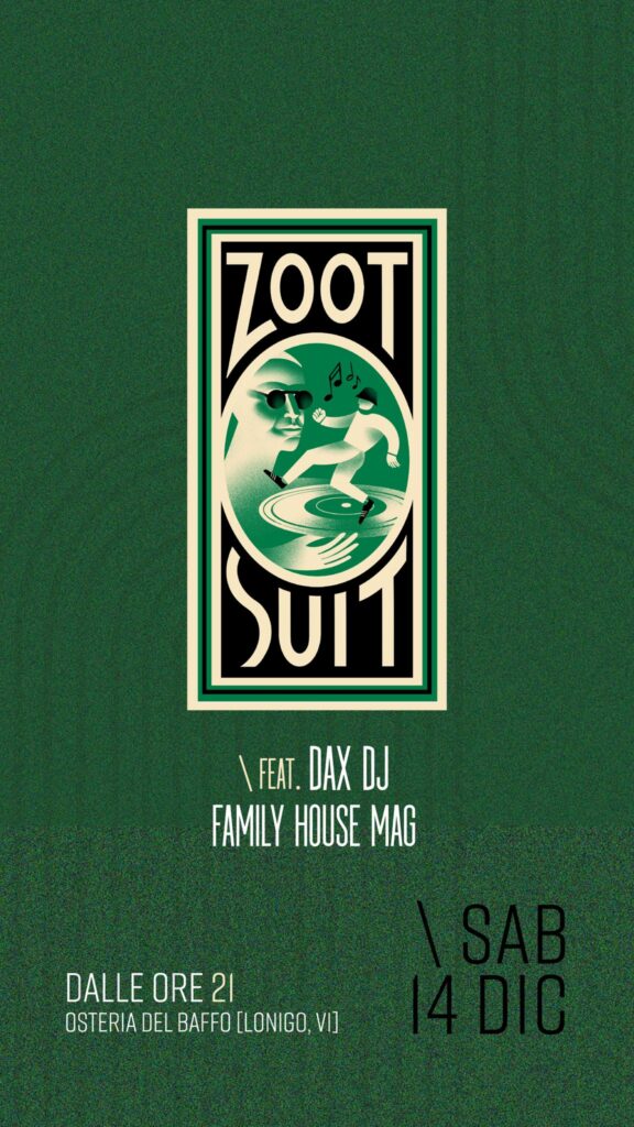 La formula per Zoot Suit Unconventional Records Club EP.02 Vi aspettiamo sabato 14 dicembre, presso @osteria_del_baffo_ Dalle 21.00 free vinyl dalle 22.00 Dax DJ c/o Osteria Del Baffo Piazza Garibaldi, 49 – Lonigo