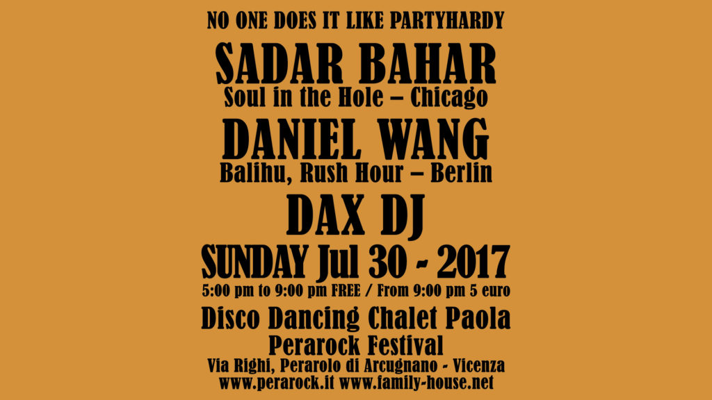 Sunday | Domenica 30 Luglio 2017 dalle 17:00 alle 02:00 Line-up / Sadar Bahar Daniel Wang Dax DJ Partyhardy torna a far ballare lo Chalet Paola! Lieti di approdare in una location storica dei Colli Berici, immersa nel verde, che negli anni ha fatto ballare migliaia di persone e più di tre generazioni. Un evento […]