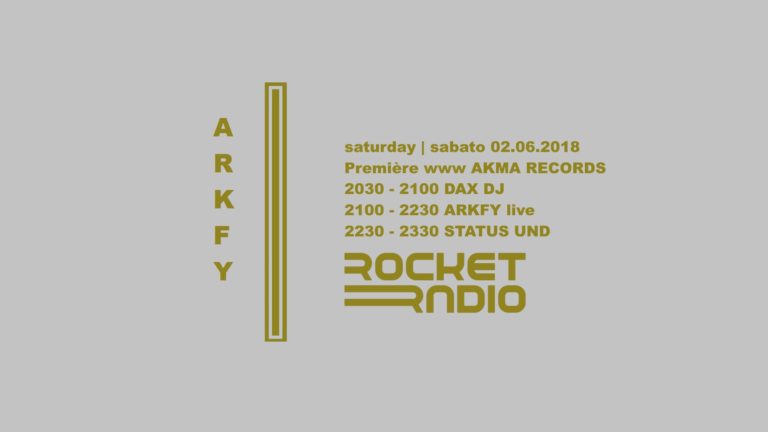 saturday | sabato 02.06.2018 Première www AKMA RECORDS 2030 – 2100 DAX DJ https://rocketradiolive.com/broadcast/label-009-w-arkfy-showcase-feat-dax-dj 2100 – 2230 ARKFY live https://rocketradiolive.com/broadcast/label-009-w-arkfy-showcase-feat-arkfy-live 2230 – 2330 STATUS UND https://rocketradiolive.com/broadcast/label-009-w-arkfy-showcase-feat-status-und – finest electronic music
