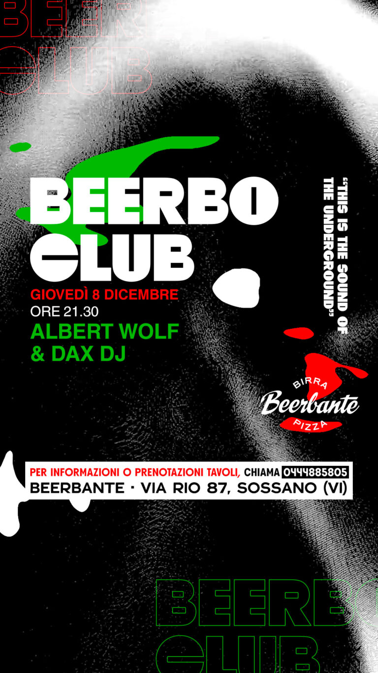 Giovedì 8 Dicembre 2022, ore 21:30 “This is the sound of the underground” Albert Wolf & Dax DJ Per informazioni o prenotazioni, chiama 0444 885805 Beerbante – Via Rio, 87