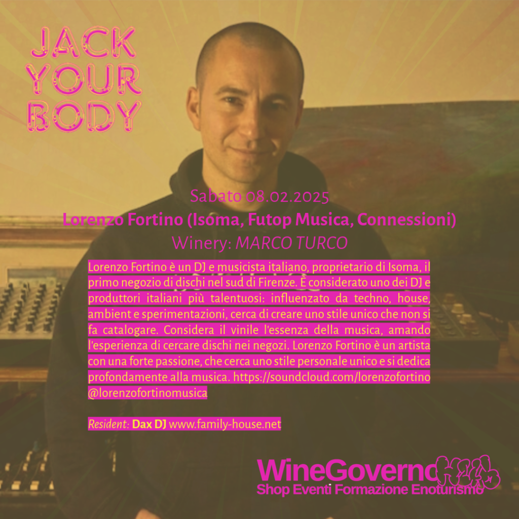 Sabato 08.02.2025 Lorenzo Fortino (Isoma, Futop Musica, Connessioni) Winery: MARCO TURCO Lorenzo Fortino è un DJ e musicista italiano, proprietario di Isoma, il primo negozio di dischi nel sud di Firenze. È considerato uno dei DJ e produttori italiani più talentuosi: influenzato da techno, house, ambient e sperimentazioni, cerca di creare uno stile unico che […]
