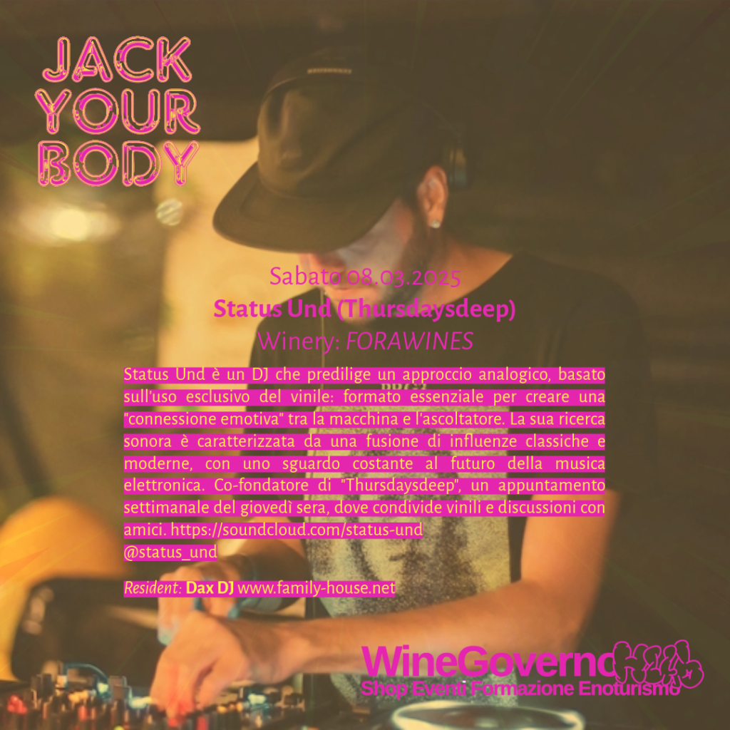 Sabato 08.03.2025 18:00 to 02:00 – INGRESSO GRATUITO Resident: Dax DJ Guest: Status Und (Thursdaysdeep) Winery: FORAWINES Status Und è un DJ che predilige un approccio analogico, basato sull’uso esclusivo del vinile, per creare un’esperienza musicale profonda e coinvolgente: formato essenziale per creare una “connessione emotiva” tra la macchina e l’ascoltatore. La sua ricerca sonora […]