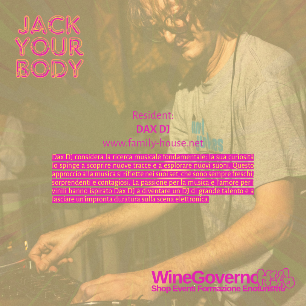 Dax DJ in collaborazione con Max Trevisan @cantinadeltormento @winegoverno @wivood @fromdiscovicenza @winegoverno_hub @cucinadeltormento presentano una serie di eventi denominati “Jack Your Body”. Un’esperienza di connessione profonda con il ritmo e la comunità! Ogni evento oltre alla musica elettronica e house, presenterà un vignaiolo del territorio. Sabato 08.02.2025 – 08.03.2025 – 12.04.2025 – 17.05.2025 dalle 18:00 […]
